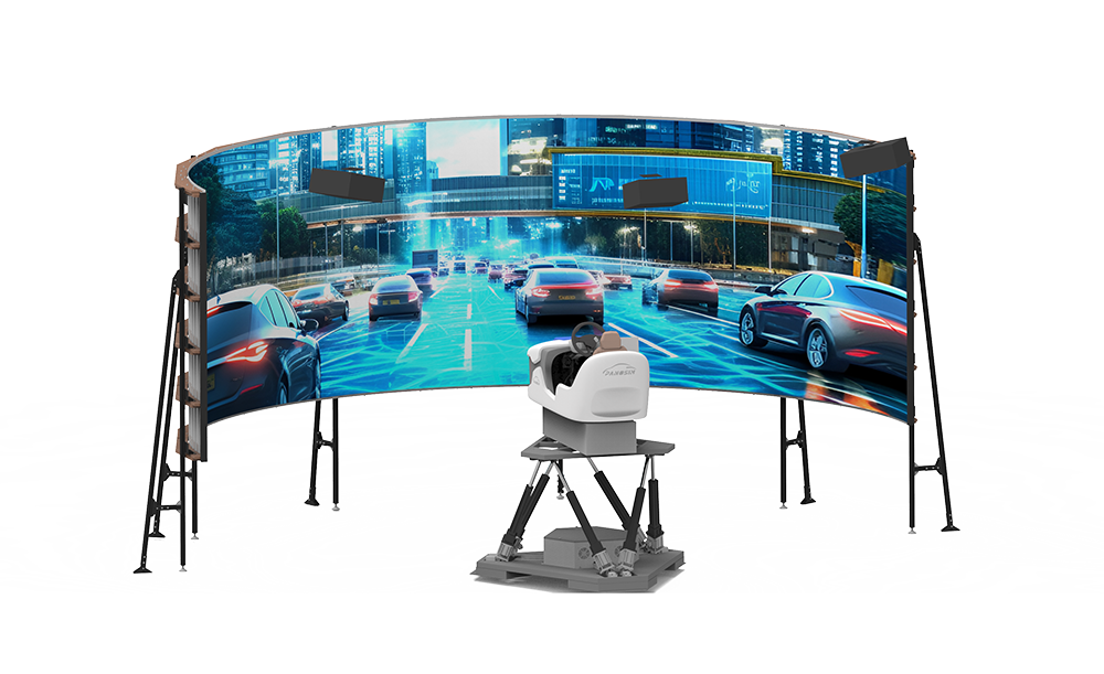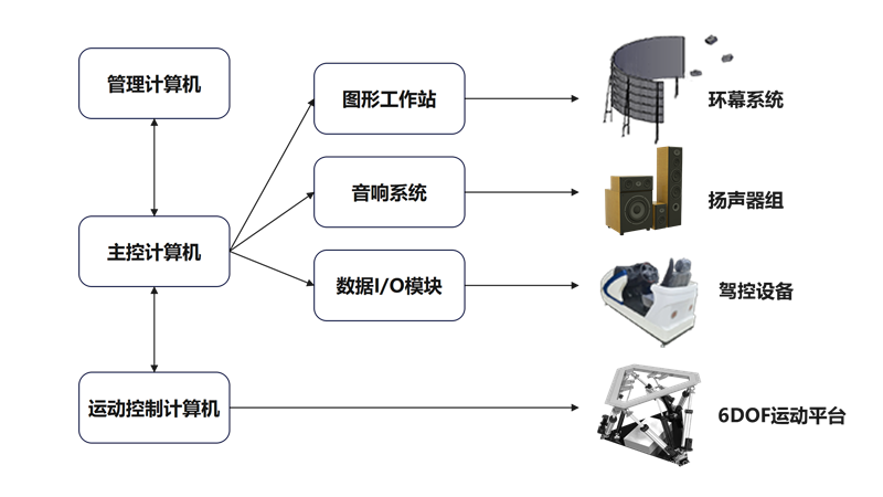 智能驾驶仿真模拟器系统硬件主要由汽车驾驶操纵设备、数据I/O模块、计算机/工作站、音响设备、运动平台、环幕系统等组成。